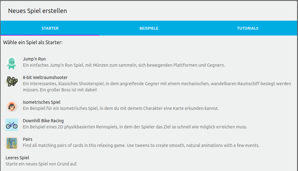Ein neues Fenster wird geöffnet. Es enthält eine Liste von Optionen, mit denen Sie aus Vorlagen/Beispielen auswählen oder ein leeres Projekt erstellen können. Die Beispiele zeigen, wie eine bestimmte Funktion verwendet wird, während Starter fortgeschrittenere Spiele sind, die Sie ausprobieren, studieren und modifizieren können.