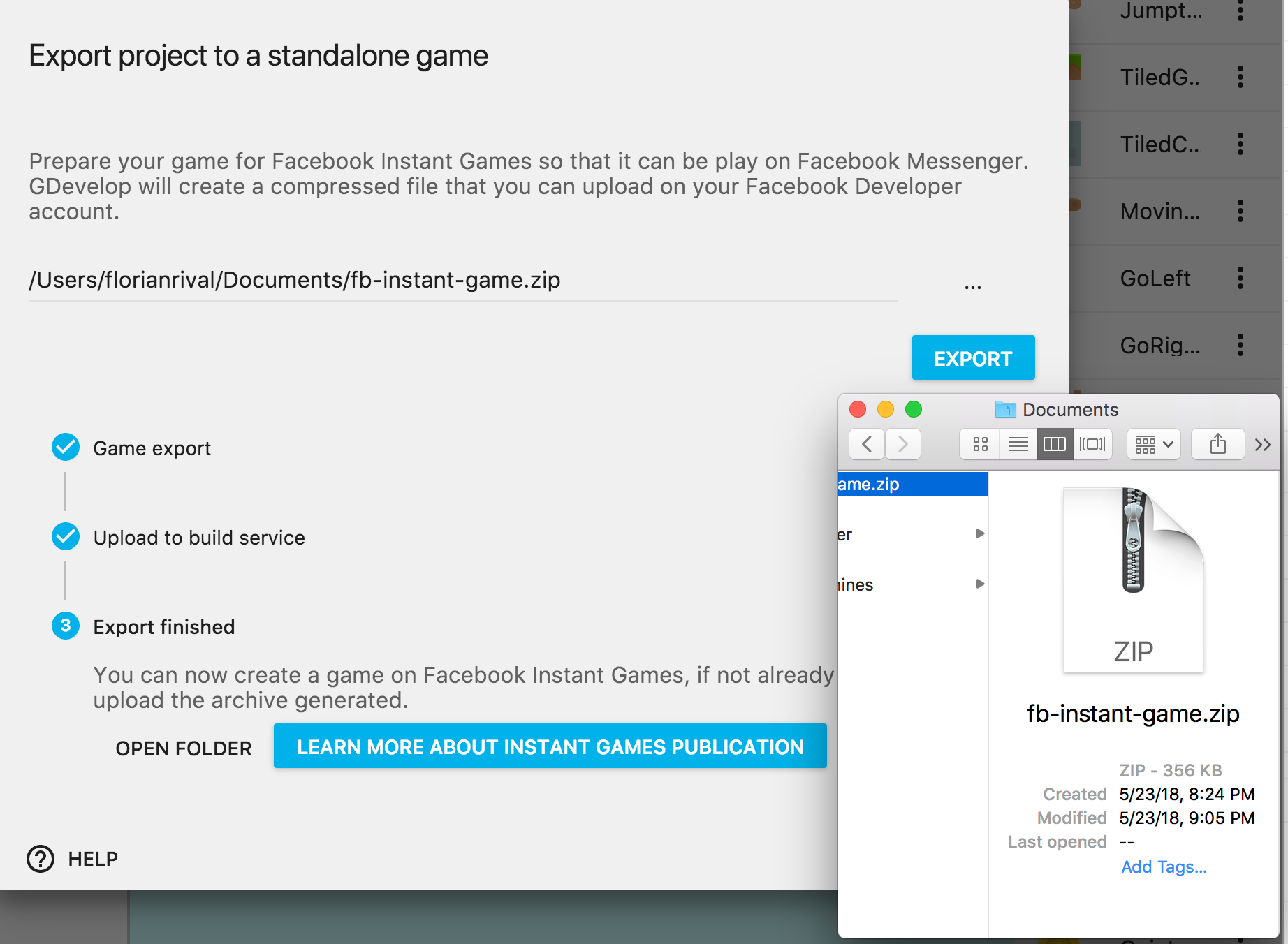 Dans la fenêtre, cliquez sur Export. Après quelques secondes, lorsque l'exportation est terminée, cliquez sur Ouvrir le dossier pour voir le fichier contenant votre jeu :