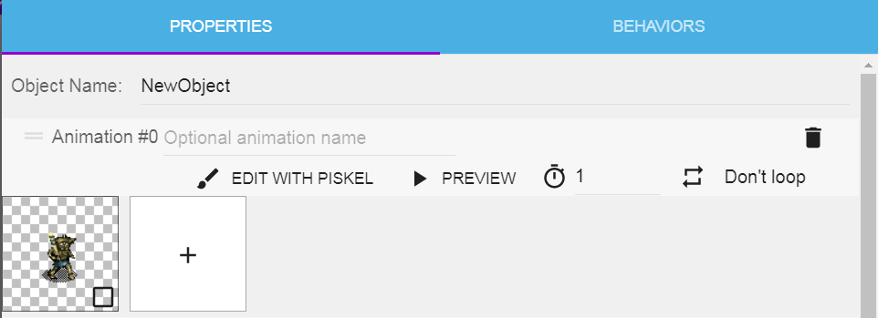 L'objet est actuellement vide. Les objets Sprite sont composés d'animations, et chaque animation peut contenir une ou plusieurs images. Ajoutons une animation. Cliquez sur le bouton +.