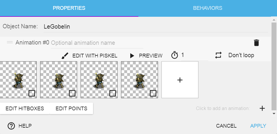 , puis sélectionnez Edit Object. Nous allons ajouter avec le +, et ajouter goblin_frame_1.png, goblin_frame_2.png et goblin_frame_3.png, soit :