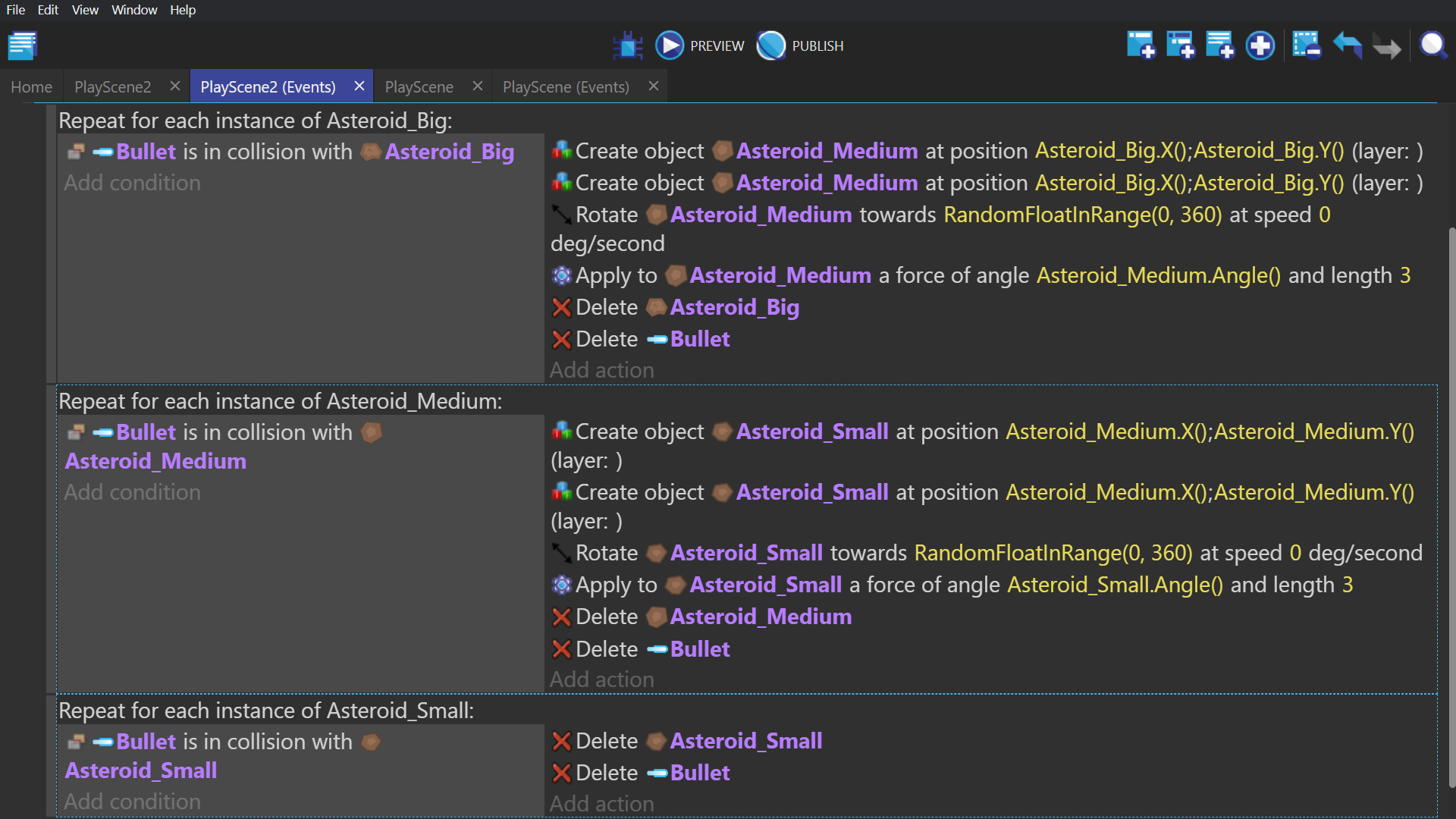 Action: -"Create an object" and select Asteroid_Medium. Set this to create at the X and Y coordinates of Asteroid_Big. -Copy and paste that "Create an object" action in to the same event, so a second medium asteroid is created when the big asteroid is destroyed. -"Rotate toward angle" setting RandomFloatInRange(0, 360) as the angle to rotate towards, with an angular speed of 0. -"Apply force (angle)" (Physics Engine) setting the angle to be the angle of the medium asteroids. With a length of 3. -"Delete the object" and select the big asteroid. -"Delete the object" and select the bullet.