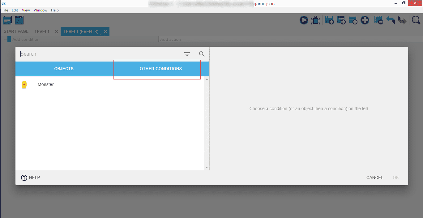 In the popup, you will notice there's our Monster on the list of objects, but we're not interested in him right now. Click on the "Other conditions" tab to expand the list of options.