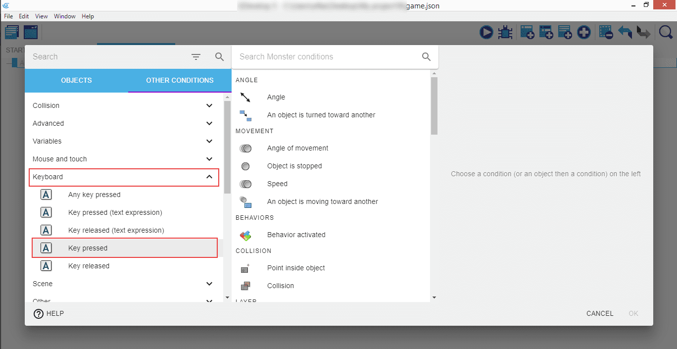 Don't have the "Other conditions" tab? Don't panic! Go to GDevelop preferences (click on the "File" menu, or "GDevelop 5" on macOS, then "Preferences"). Activate "Use the new action/condition editor". You can then go back to the tutorial.