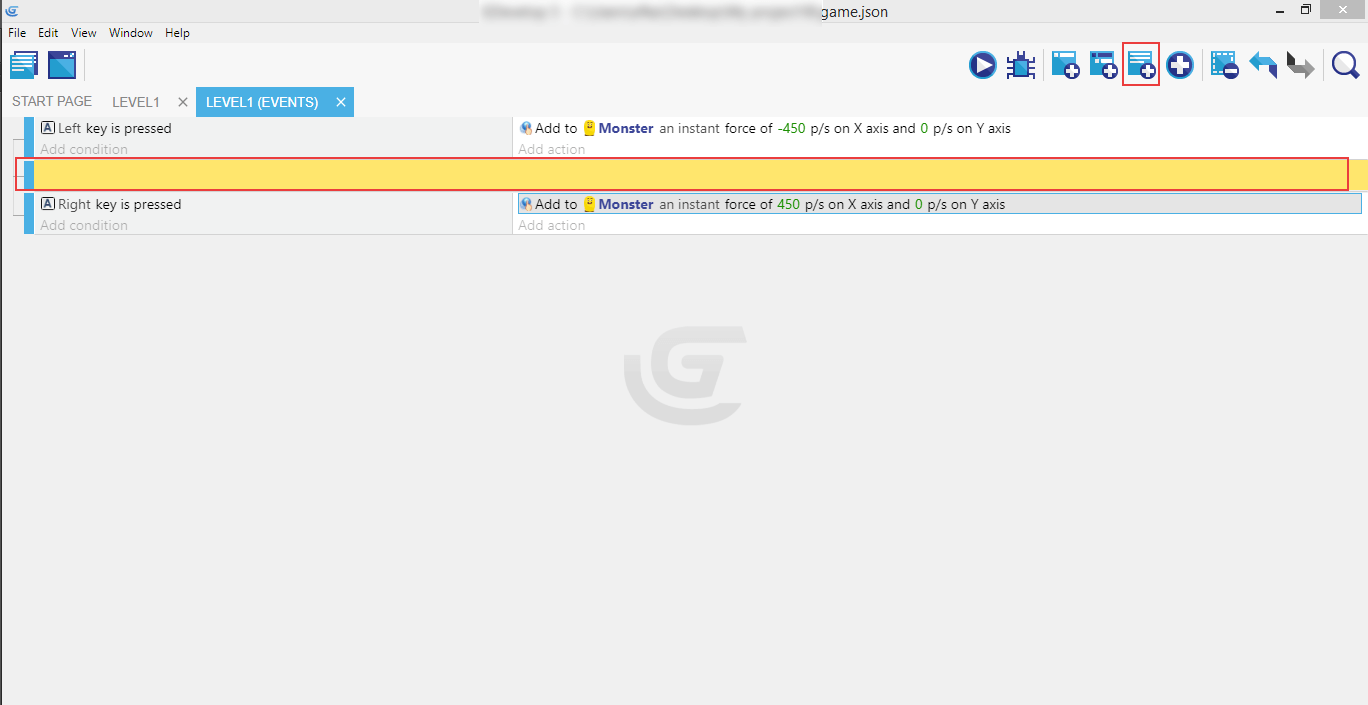 You can see the final version of the event we just completed - with conditions on the left, and action on the right: when you press the left key, then it will move (by applying the force of -450 units on the X axis and ignoring the Y axis with 0 value) to the left edge of the screen.