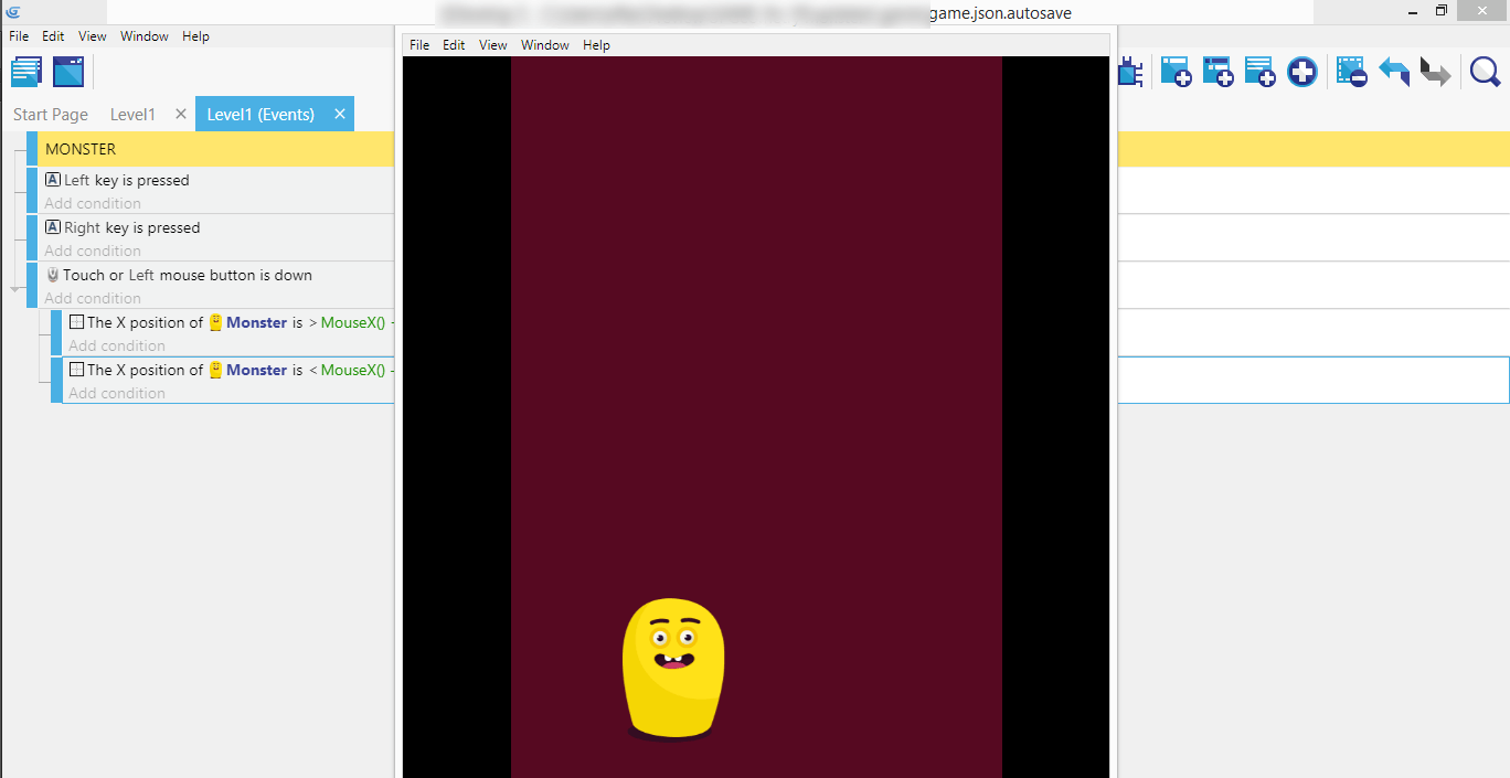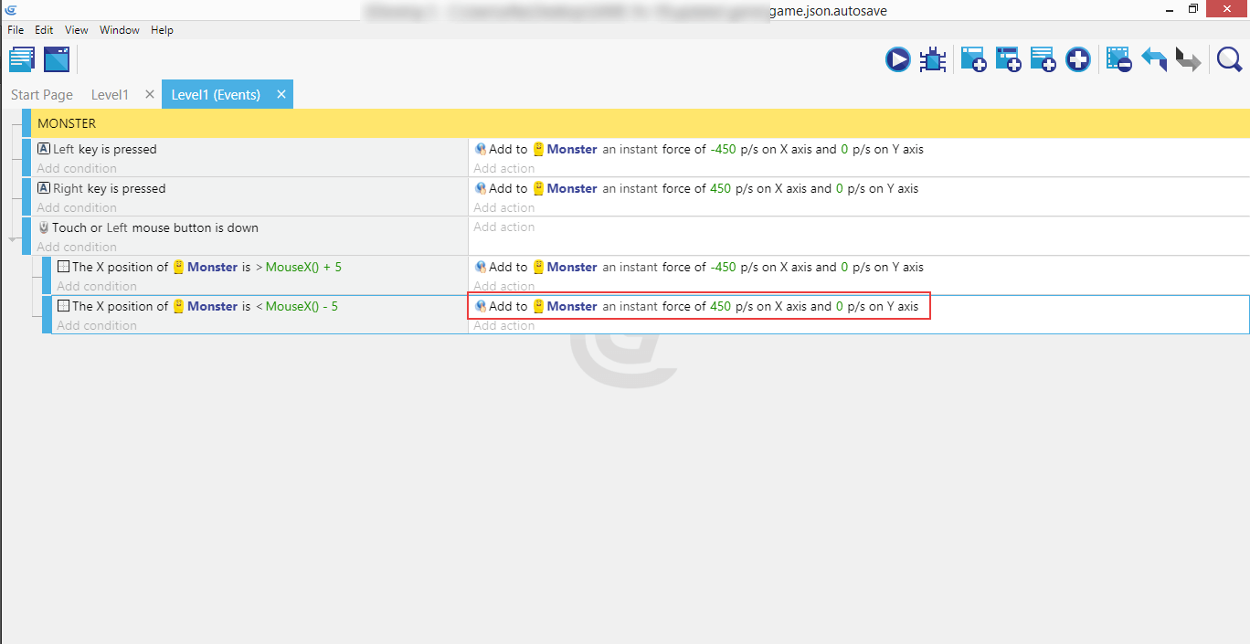 If you completed the right movement, both events with their conditions and actions should now be in place, so the Monster can move in either direction - left or right.